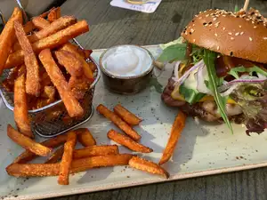 Alles sehr appetitlich angerichtet und es hat wie immer herrlich geschmeckt. Man merkt die hohe Qualität und Frische mit jedem Bissen. Das Patty war saftig, das Brioche-Brötchen weich und nur wenig angetostet. Die Süßkartoffelpommes knusprig und weich im inneren und der Dip frisch säuerlich und cremig.