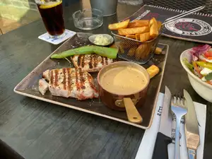 Sonst hatten wir noch ein Schweinesteak mit Pfeffersauce und Pommes.